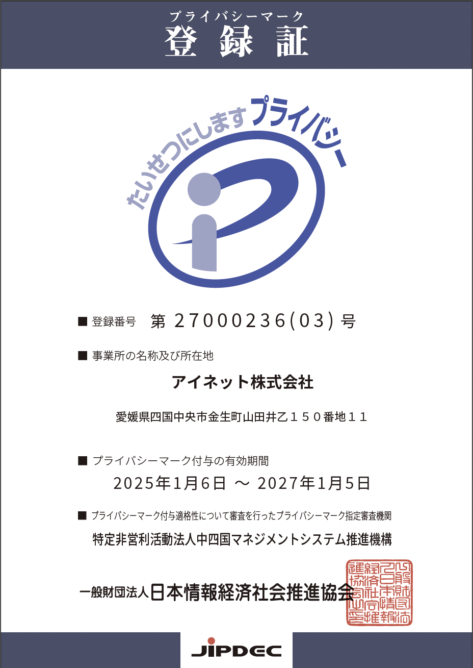 アイネット株式会社では、2020年12月17日に一般財団法人日本情報経済社会推進協会(JIPDEC)より、プライバシーマーク付与の認定を受けました。